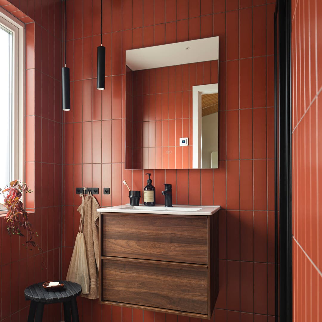 Rött kakel och beige klinker – så formades två badrum i 70-talsvillan