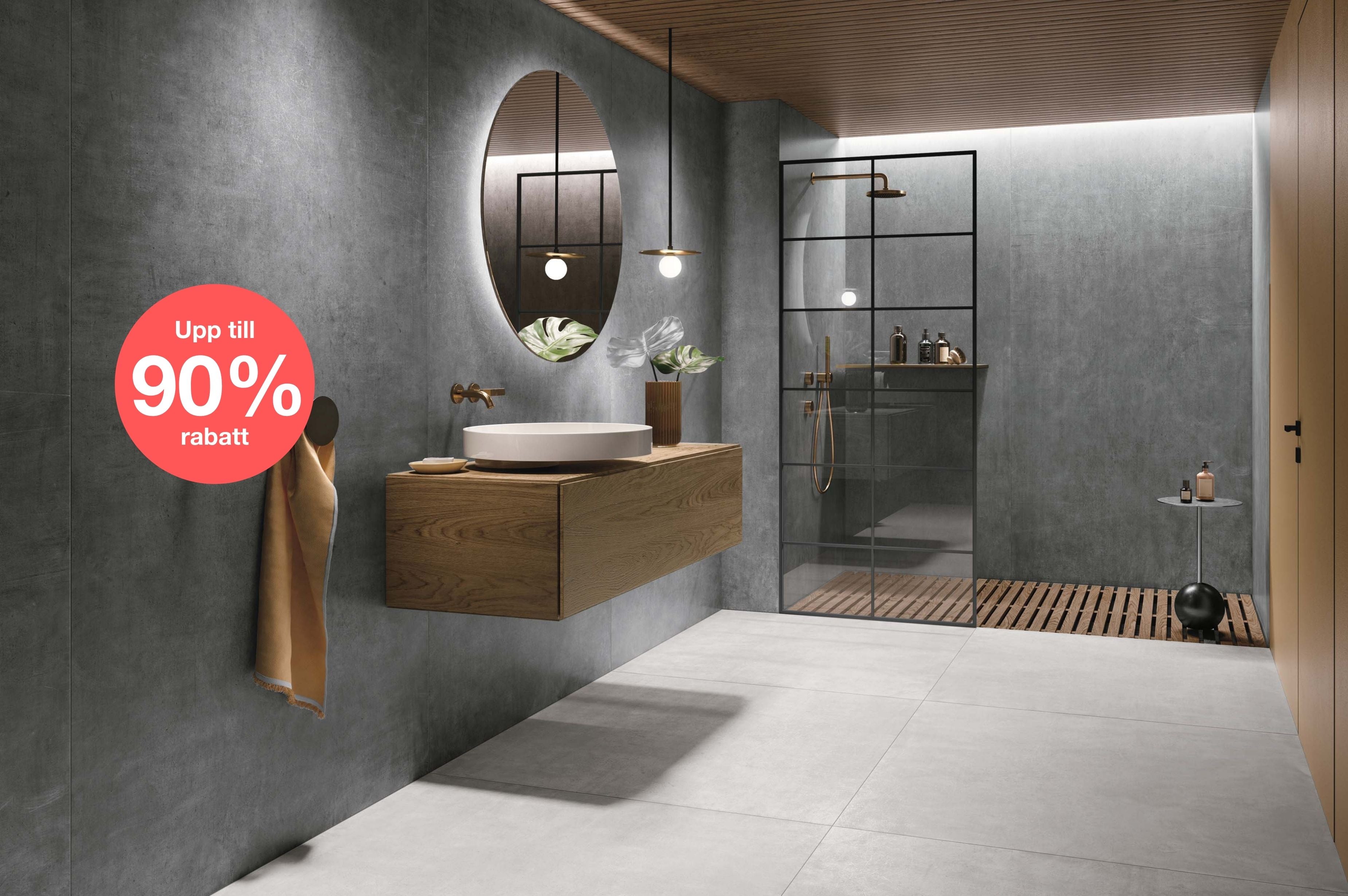 På gårdsplanen utanför butiken kan du göra ett riktigt klipp! Här säljer vi ut kakel, klinker och mosaik med upp till 90 % rabatt. Även inne i butiken är det fyndläge. Där hittar du utvalt kakel och klinker till 30-70 % rabatt och badrumsmöbler (utställningsexemplar) till kraftigt nedsatta priser.