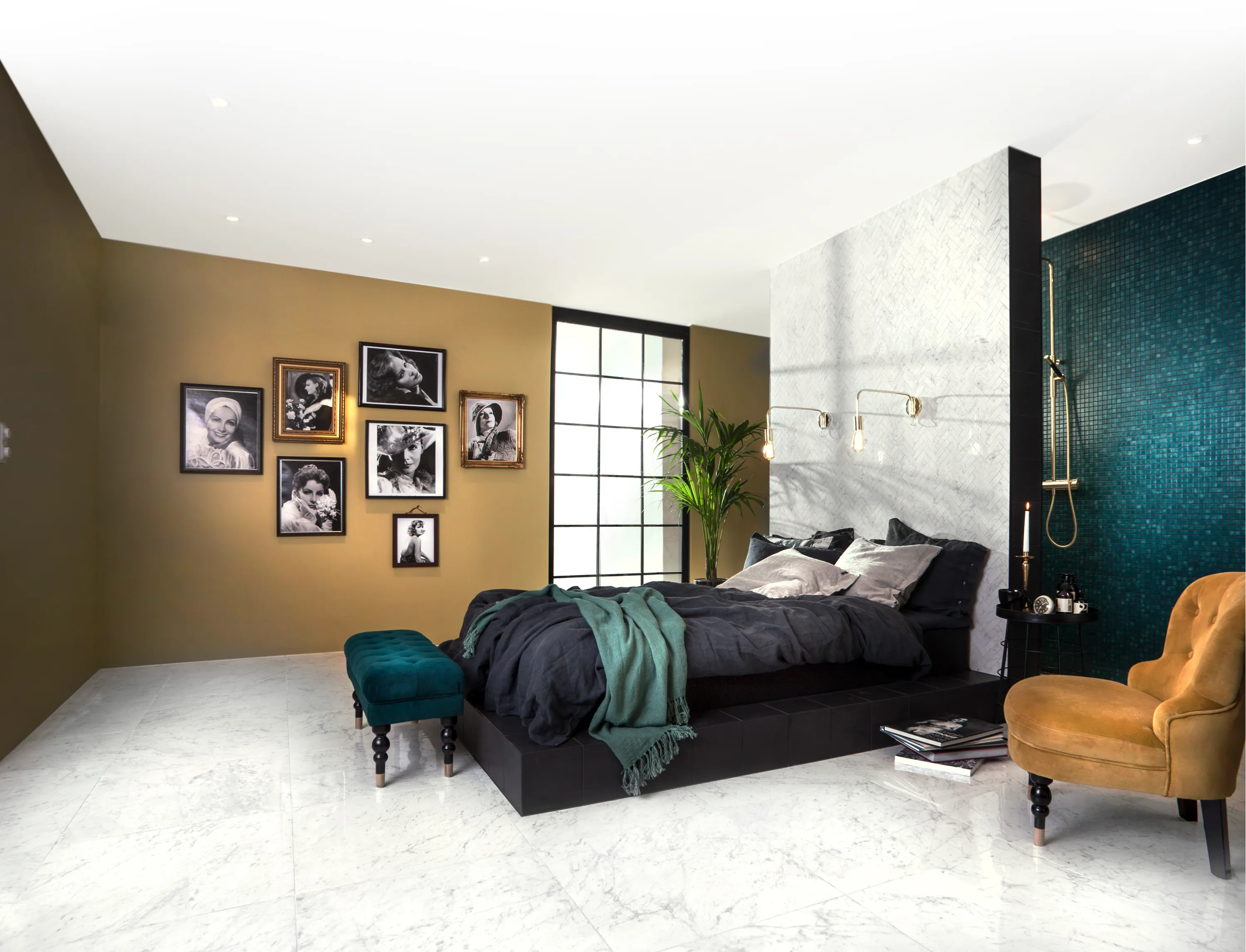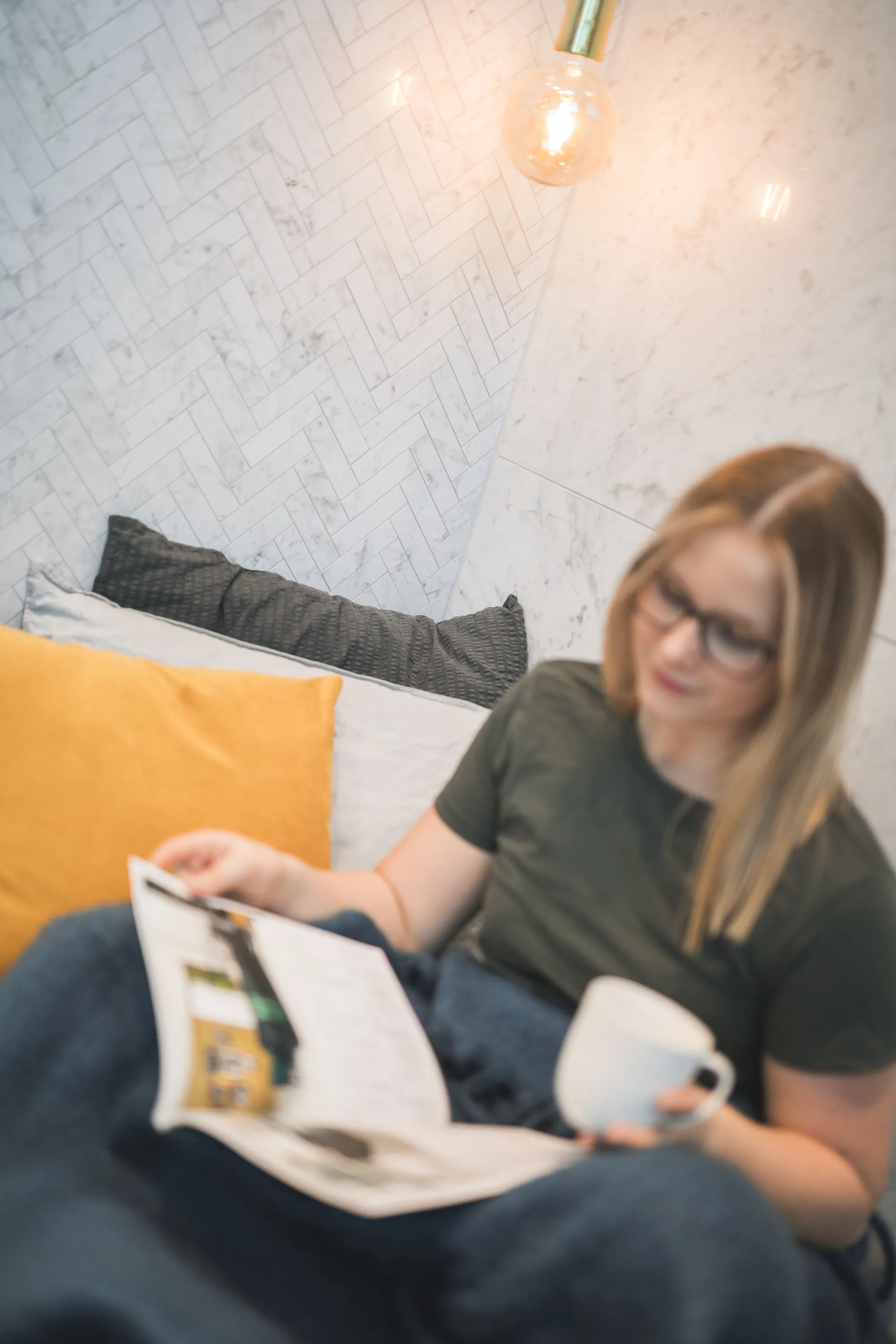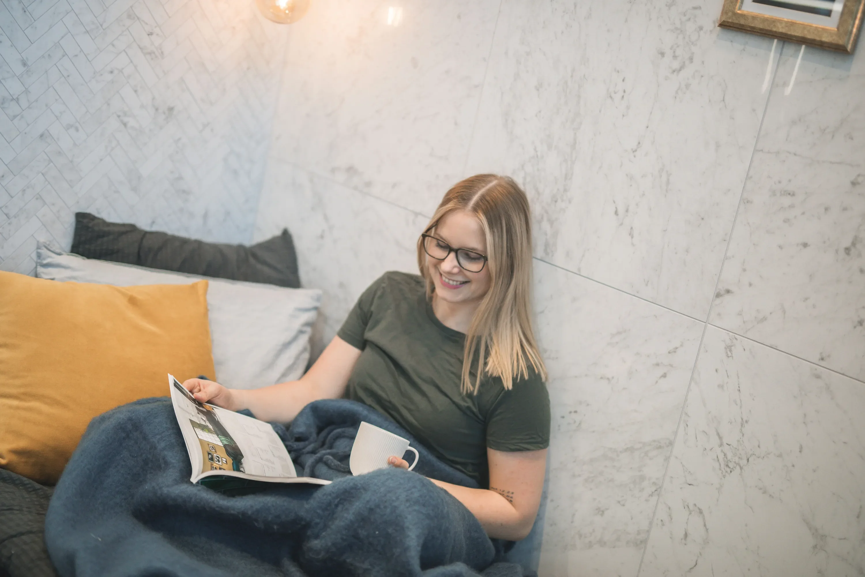 Stavmosaik som bildar ett vackert fiskbensmönster. Den elegant mosaiken består av marmormönstrade plattor – en reproduktion av den Italienska marmorn Carrara. Ytan är polerad och ger en exklusiv känsla med sin naturtrogna ådring. Använd mosaiken på golv och vägg, i exempelvis badrum, toalett eller i kök. Antingen på en större yta eller som dekor. Marmi Carrara finns i flera storlekar och format.