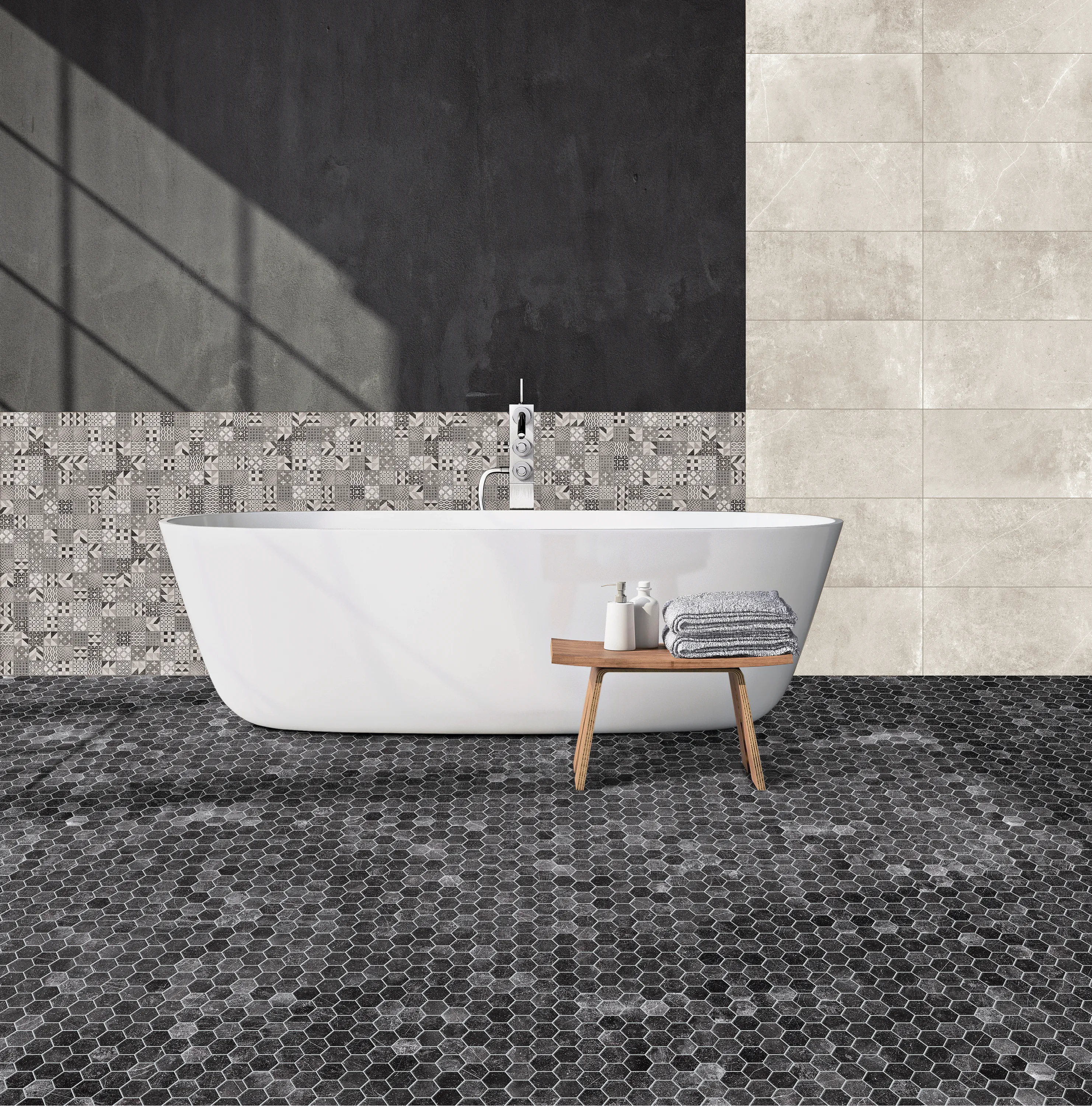 Svart hexagon-klinker med matt yta. Hexagonerna skiftar i färg vilket ger ett rustikt och naturtrogen intryck. Använd på en större yta eller på utvalda delar av golv eller vägg för att skapa kontras mot kvadratiska plattor. I serien Panarea finns flera format.