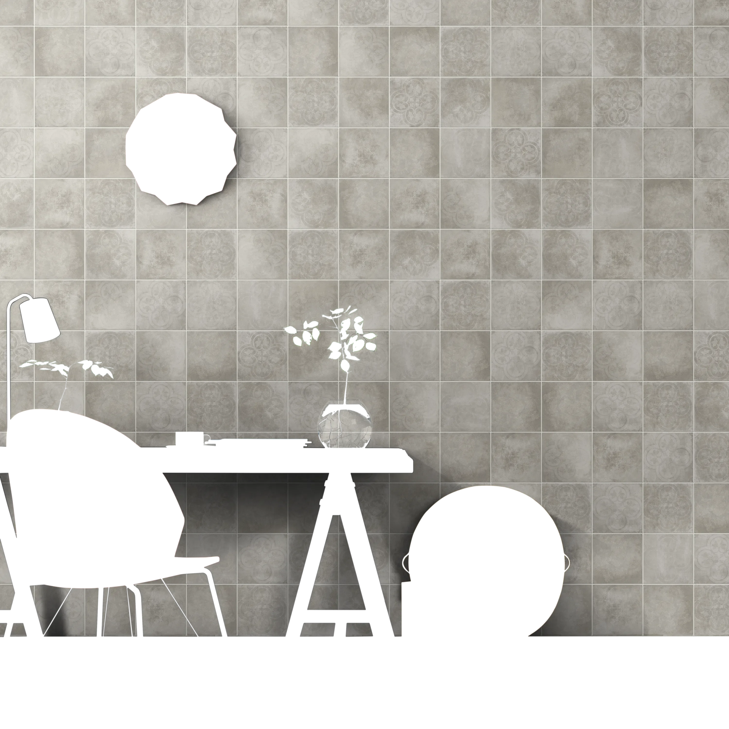 Grå klinker med rustik yta och ett svagt mönster inspirerat av marockansk stil. Plattornas kanter är tydligt brutna vilket ger en patinerad känsla. Komplettera gärna med tillhörande enfärgade plattor.